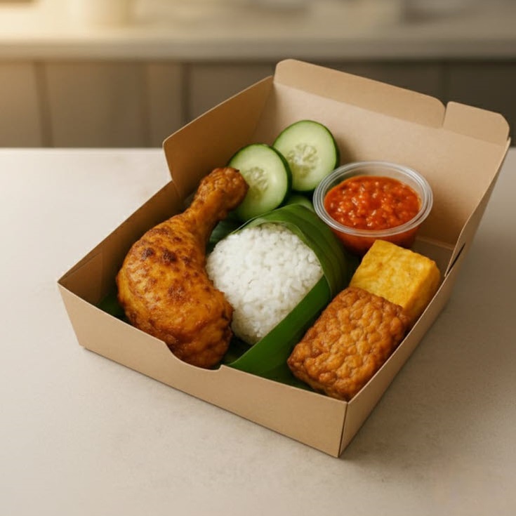 Kami menyediakan porsi yang besar untuk nasi, ayam, tempe, tahu, dan sambalnya. Dijamin membuat Anda puas!